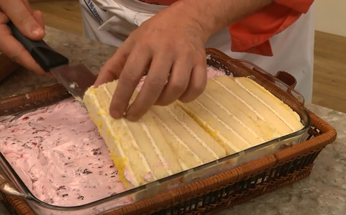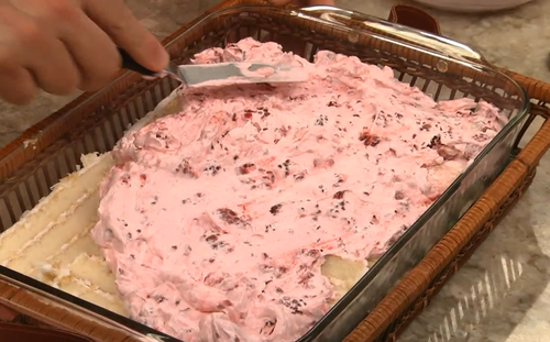 - Cut lemon cake into 7 slices. Place slices in a single layer over raspberry mixture. Evenly spread remaining whipped topping over lemon cake layer. Freeze until ready to serve. Let sit 10 minutes, then cut into squares.