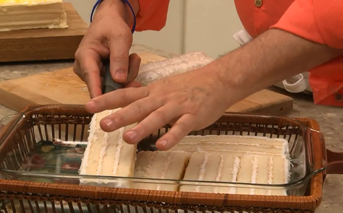 - Cut coconut cake into 7 slices. Place in a single layer in a 9- x 13-inch baking dish, covering the bottom of the dish.