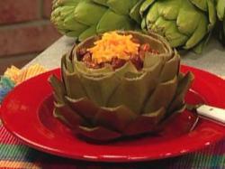 - Divide chili evenly among the steamed artichoke "bowls," and top each with 1/4 cup cheese. If desired, heat in microwave for 15 seconds, or until cheese is melted.