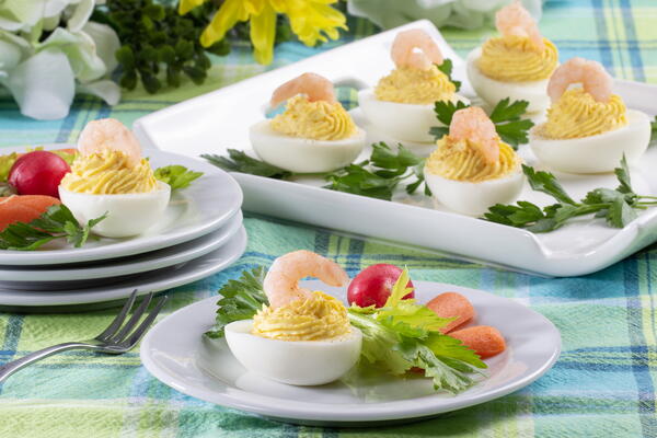 We can’t think of a better way to fancy up your Easter table, or really any table, than with these Party Perfect Deviled Eggs. What makes them so special is the combo of the sour cream and Greek yogurt, along with just the right amount of zing that we get from the mustard and horseradish. And when you top these off with a few fresh-from-the-freezer baby shrimp, it’s the ultimate finishing touch.
