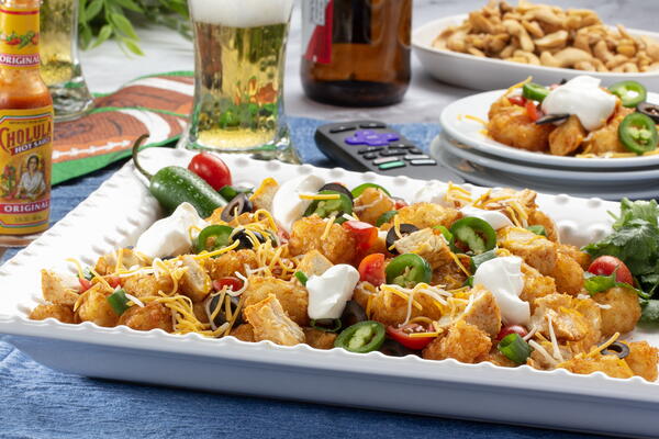 Try saying that three times fast! Whether you’re looking for something to serve during the big football game or a fun-to-eat weeknight dinner, this is it. It’s got everything you want on one platter. Chunks of chicken, crispy potato tots, and lots of your favorite toppings create a meal that’s always a game day winner.
