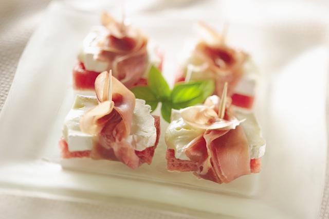 - Place a piece of Brie on top of each watermelon finger and wrap each with a sliced of ham. Secure with a toothpick.
