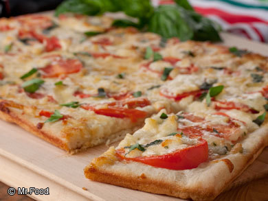 - Preheat the oven to 375 degrees Unroll pizza crust, and press into a 10" x 15' rimmed baking sheet, sprinkle with 1 cup mozzarella cheese. Arrange tomato slices over cheese.