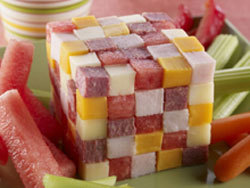 i would use chicken or turkey cubes and ham rather than summer sausage (for less fat) and low-fat cheese. a rubik cube made with fruits (of the same colors) would be awesome for dessert to go along with the protein cube. perfect for finger foods or snacks