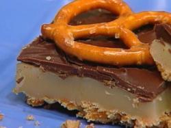 I made these for the 1st time in 2010 when I saw the recipe on the show. The crust was not firm and I had some trouble with it pulling up. I just made them again early 2012 -- I used 1 1/2 x crust recipe and a 9 x 13 pan- I crushed pretzels in food processor. I cooked filling less than suggested and poured it over the crust-- so even though the crust was not solid it did not pull up. I decided melting the chocolate was a waste of time, so I just sprinkled choc chips over all and then I used whole pretzels in rows on the top. I chilled overnight and it cut into squares w/ 1 pretzel on top per square. Everyone