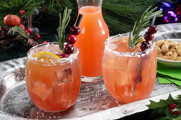 - Place water on a shallow plate. Place sugar on another shallow plate. Dip a glass in water, then dip immediately into sugar to coat rim. Repeat with remaining glasses. Fill each glass halfway with ice cubes. Pour cocktail mixture over ice and top with ¼ cup Prosecco. Garnish each cocktail with an orange slice, cranberry skewer, and rosemary sprig. Enjoy!