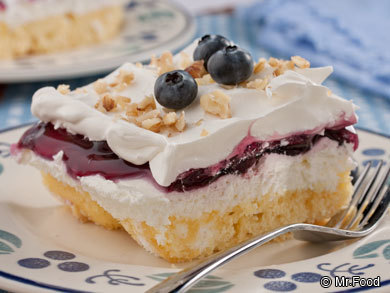 I make almost the same thing, I use sponge cake broken up into a 9x13 pan. I mix vanilla pudding usually the night before so that it will be cold, spread it on the top of the cake, then the blueberries, cook whip. I sometimes sprinkle nuts on the top of the cool whip. Refrigerate until ready to serve.