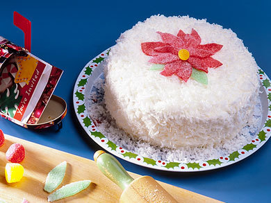 - Using a rolling pin, roll out each gumdrop to a 3-inch circle, pressing flattened gumdrops into sugar as they become sticky. Using a knife, cut poinsettia leaves out of red gumdrops and stems out of green gumdrop. Form a poinsettia in center of the cake. Cover loosely and chill at least 2 hours before serving.