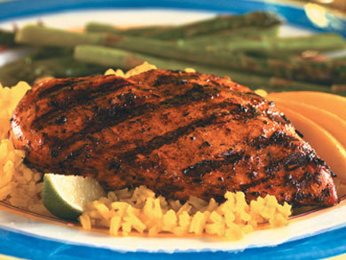 - Spray cold grill rack with cooking spray; preheat the grill to medium-high heat (350 to 400 degrees). Combine lime juice and oil in a small bowl; brush over both sides of chicken. Sprinkle chicken evenly with seasoning.