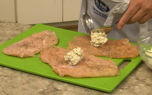 I made a version of these using freshly grated asiago cheese and kalamata olives, and it was very good. My chicken breasts were rather thick, so I put them between 2 sheets of plastic wrap and pounded them thinner with the flat side of a meat mallet. I have made stuffed breasts in a sheet pan before, and the filling leaked out and burned. This method keeps it all inside!