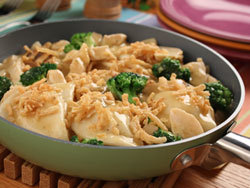 The easy convenience of a variety of frozen foods makes this kid-pleasing Chicken Pierogi Skillet supper an instant hit. The bonus of crunchy French-fried onions guarantees this family-friendly meal will disappear in no time.