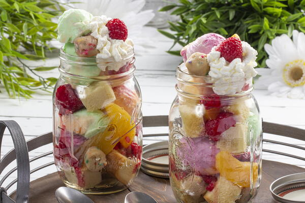 - Place a few cubes of pound cake in the bottom of a mason jar to cover the bottom. Layer with two small scoops of sherbet, a couple of slices of peaches, a few raspberries, and a couple of cookie dough bites.