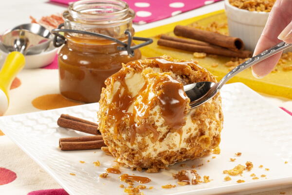 - Remove ice cream balls from freezer and roll in cereal mixture, coating on all sides and gently pressing cereal onto ice cream. Place back into container and freeze 1 hour or until ready to serve. Drizzle with caramel sauce and serve.