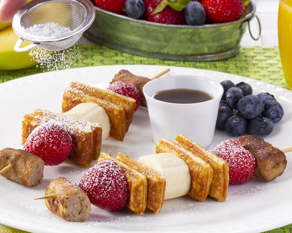 - To assemble kabobs: on each skewer, thread a piece of sausage, 1 strawberry, 2 pieces of French toast, a banana slice, 2 more pieces of French toast, 1 strawberry, and a piece of sausage (see photo). Drizzle with syrup and sprinkle with sugar, if desired; serve immediately.