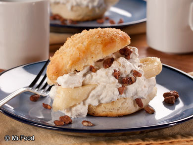 Talk about a scrumptious banana dessert recipe! Wait til you see the magic that takes place when you pair shortcut frozen biscuits with yummy banana whipped cream and praline topping and call it Banana Shortcakes with Candied Nuts!