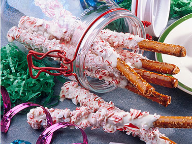 - Holding top of pretzel stick, spoon and spread melted chocolate over bottom two thirds of pretzel, allowing any excess chocolate to drip off pretzel back into pan. Sprinkle chocolate with crushed candy. Place on baking sheet and repeat with remaining pretzels.