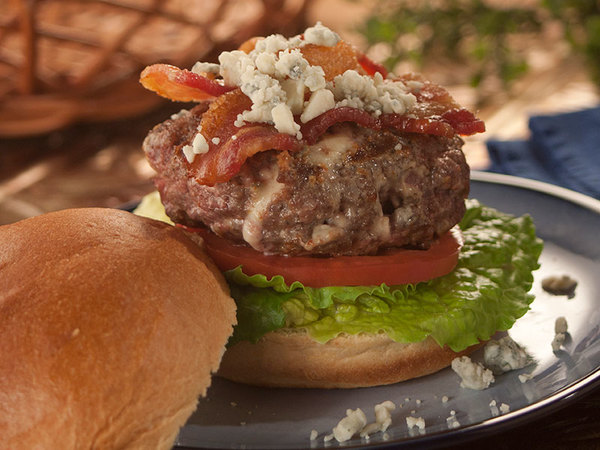 Beat the burger blues with our juicy Bacon Blue Cheese-infused Burgers. Yes that's the trick to these novel, smoky, bacon-topped burgers that cook with the cheese on the inside, so every bite is packed with robust flavor.