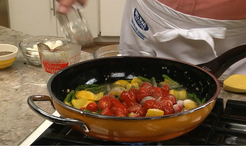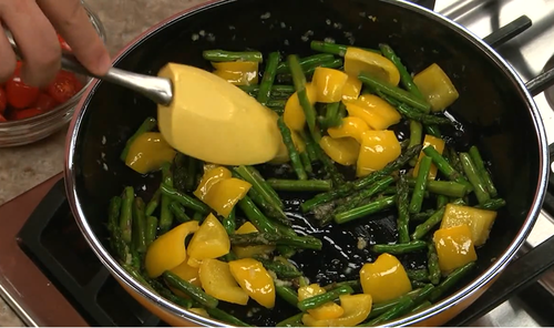 - Meanwhile, in a large skillet over medium heat, heat oil; cook asparagus, bell pepper, and garlic 5 minutes, or just until tender. Add tomatoes, chicken broth, onion powder, salt, and pepper; cook 5 minutes, or until hot.