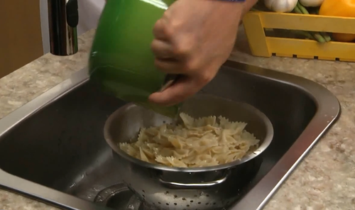 - In a soup pot, cook pasta according to package directions; drain, place in a serving bowl, and cover to keep warm.