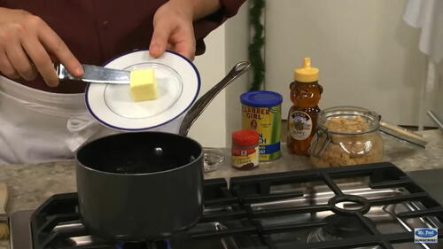 - In a small saucepan over low heat, combine remaining ingredients and cook 3 to 5 minutes, or until melted and smooth. Brush 1/3 of glaze over ham.