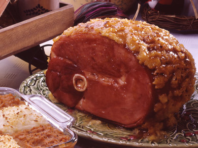 - Bake 1-1/2 to 1-3/4 hours, or until heated through and coating is crisp and brown, spooning pineapple mixture over ham every 20 minutes. Slice and serve.
