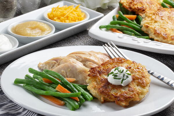 We took all the work out of Grandma’s old-fashioned potato pancakes, without sacrificing the taste or crispy-crunchy texture. The secret is, rather than grating the potatoes by hand, we start off with refrigerated ones. This means we get the old-world flavor, without all the old-work work.