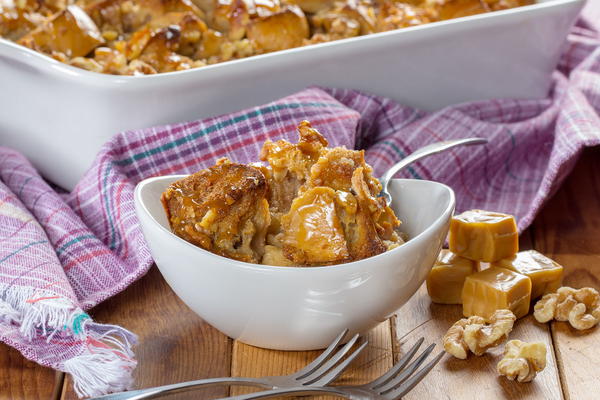 - In a large bowl, combine water and eggs; beat well. Stir in caramel mixture. Add bread cubes and walnuts, and stir until evenly coated. Let stand 5 minutes, then stir again. Pour into prepared baking dish.