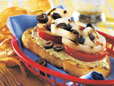 Stir together mayonnaise and pesto in a small bowl; spread evenly on 1 side of each bread slice. Top evenly with tomato and onion slices; sprinkle with olives.