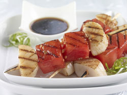 A refreshing idea for either a summery main dish or entertaining appetizer, poached sea scallops (those are the larger type) are brushed with a flavorful Asian marinade and skewered with watermelon cubes then grilled in a flash to tasty perfection.