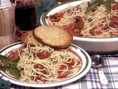 - In a large serving bowl, combine the basil, melted butter, and the remaining 1/4 cup parsley and 1/4 cup olive oil; mix well. Add the roasted tomatoes and spaghetti; toss. Sprinkle with the Parmesan cheese, and serve.